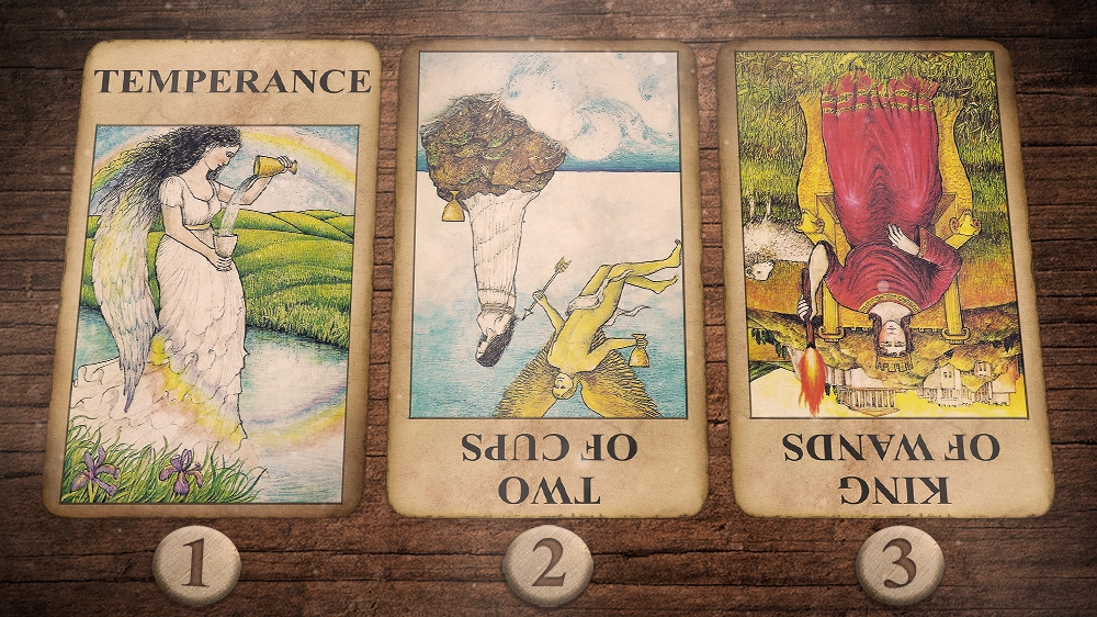 Cards: Temperance, Two of Cups (Reversed), King of Wands (Reversed)