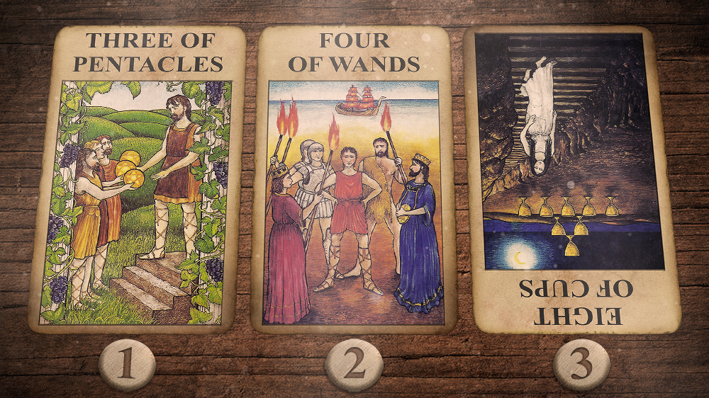Cards: Three of Pentacles, Four of Wands, Eight of Cups Reversed