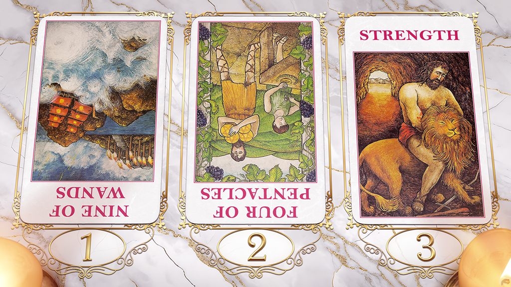 Cards: Nine of Wands (Reversed), Four of Pentacles (Reversed), Strength