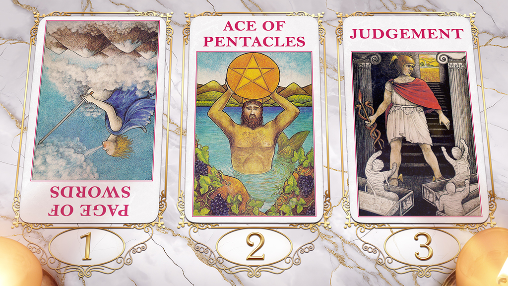 Cards: Page of Swords (Reversed), Ace of Pentacles, Judgement