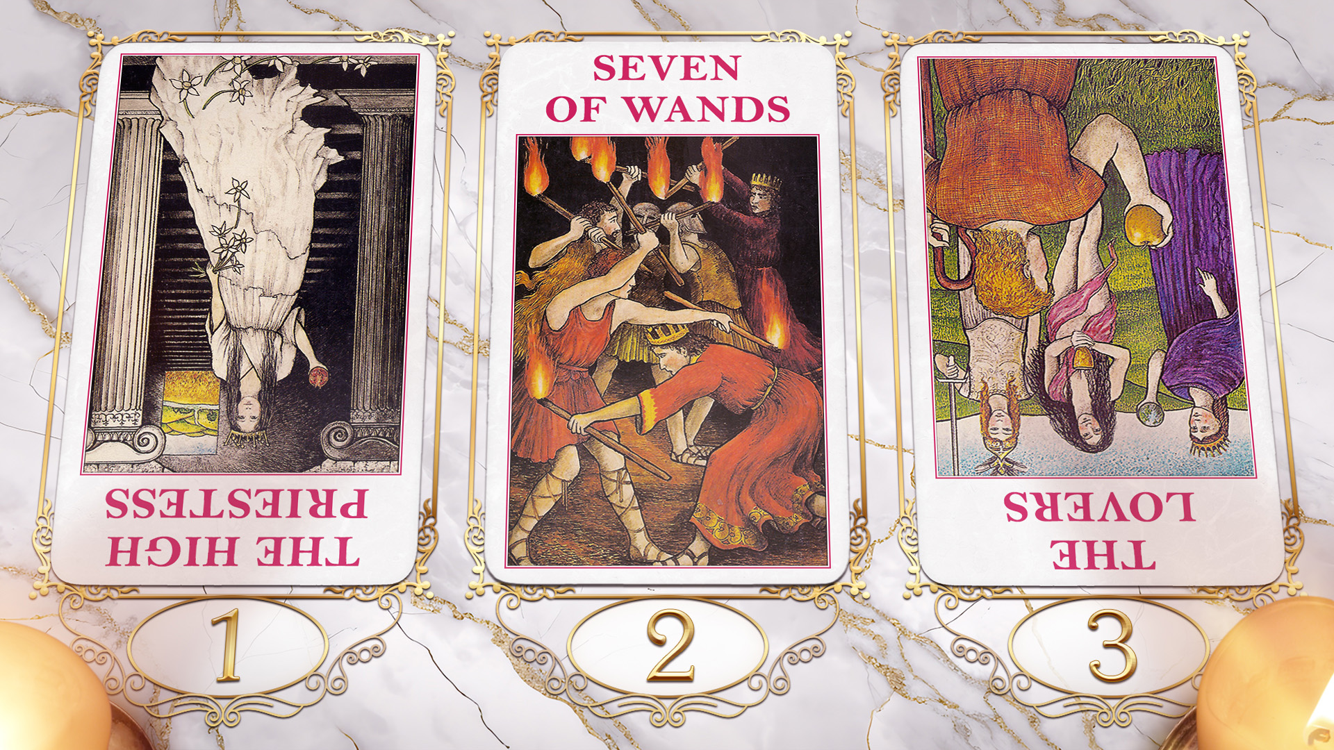 Cards: The High Priestess Reversed, Seven of Wands, The Lovers Reversed