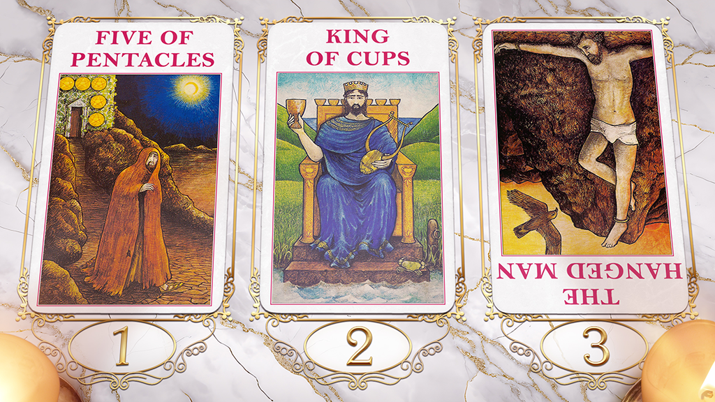 Cards: Five of Pentacles, King of Cups, The Hanged Man (Reversed)