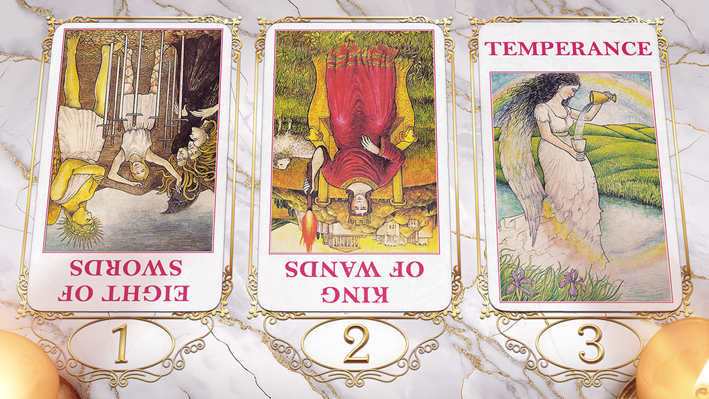 Cards: Eight of Swords (Reversed), King of Wands (Reversed), Temperance