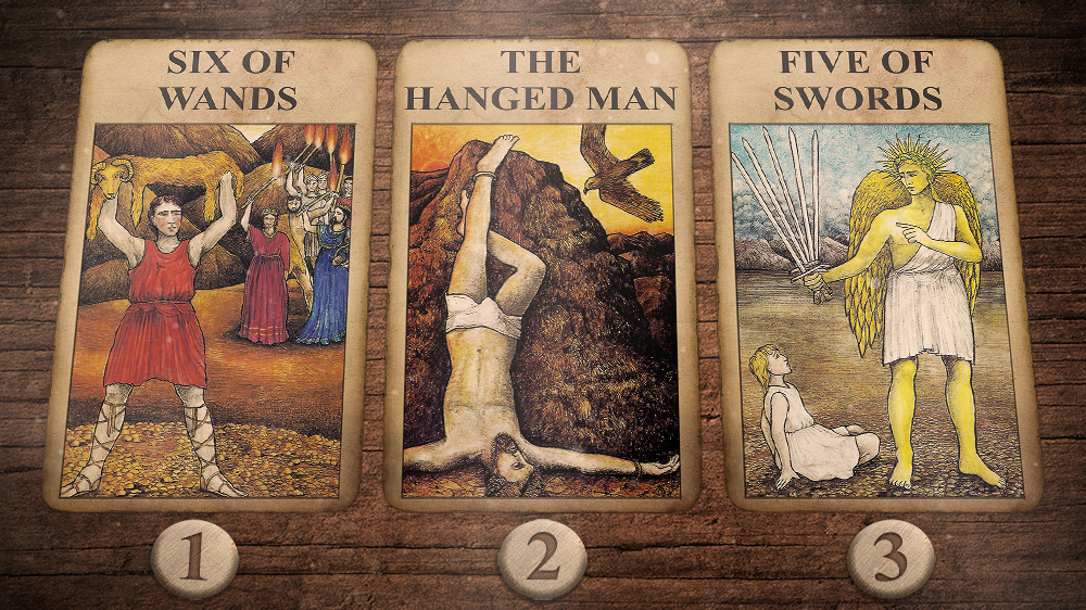 Cards: Six of Wands, The Hanged Man, Five of Swords