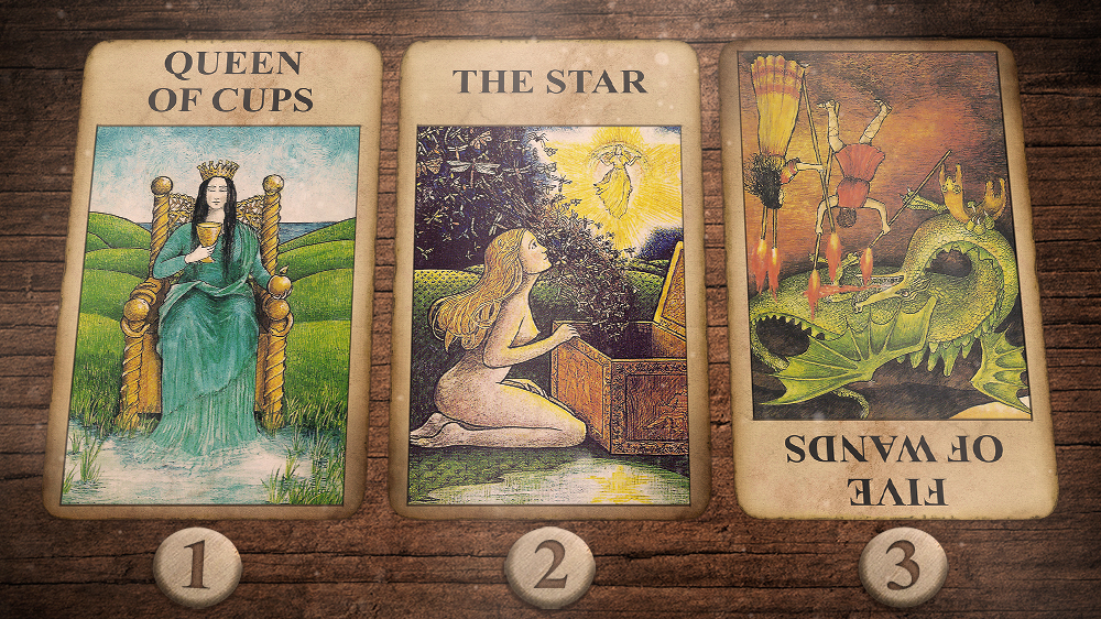 Cards: Queen of Cups, The Star, Five of Wands (Reversed)Â